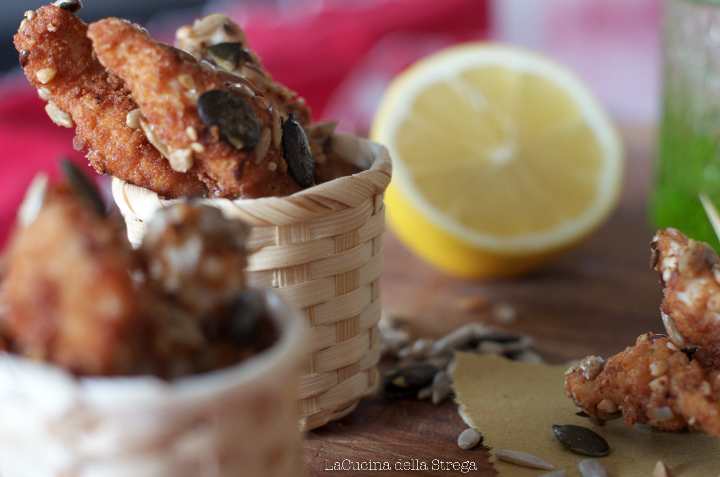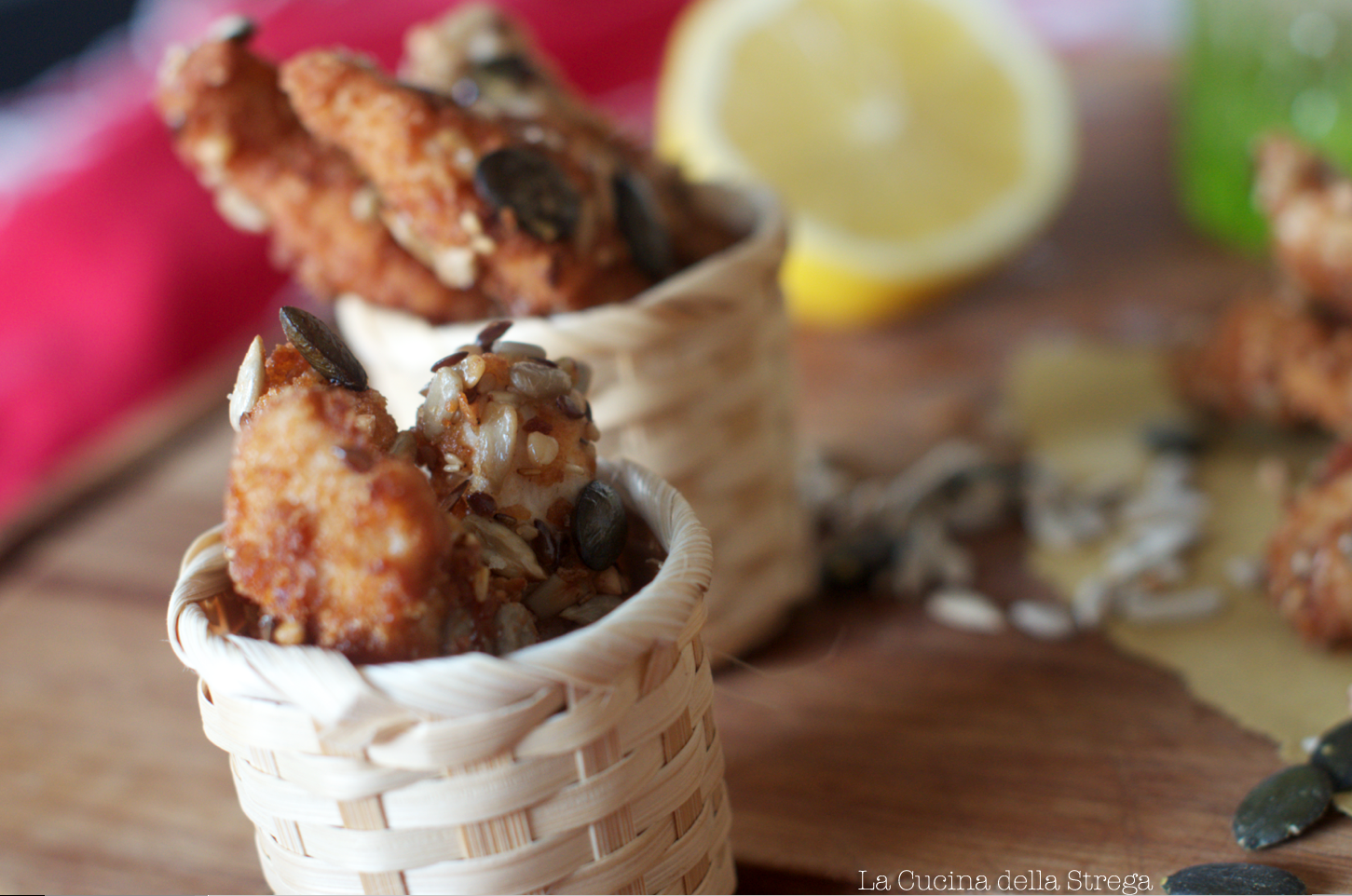 Una volta marinate, prendete le listarelle di pollo e passatele prima nell’uovo, poi nel trito di fette biscottate, poi di nuovo nell’uovo e ancora nel mix di semi.